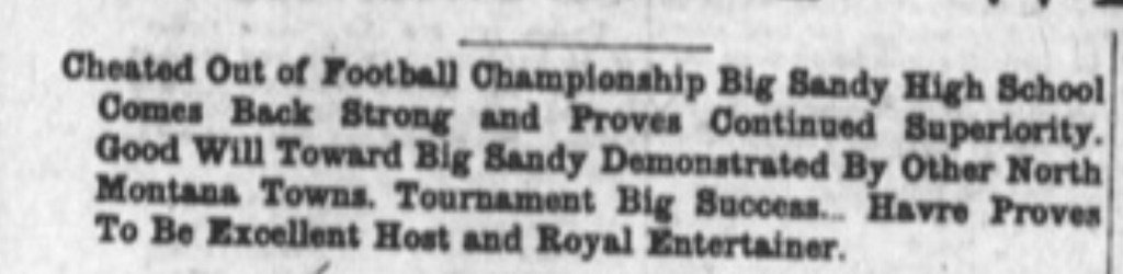 I learned this from a short, reprinted piece from the Havre paper commenting that many of the teams present for the tournament and fans were very pleased to see Big Sandy win. Many locals throughout the district were still angry that Big Sandy had won the District Football Championship and were headed to state, before the team was disqualified on a technicality!
