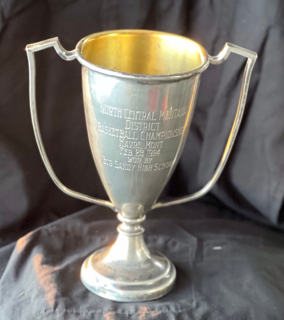 Because basketball practice was happening at the same time, we got into the school and waited in the hallway outside the gym for Dan to arrive. We spent our time checking out the old trophies on display. I was pleasantly surprised to discover a silver cup engraved with the date: February 23rd, 1924. We had learned from the program that the silver cup was the prize that went to the winner of the North Central District Basketball Championship, and here it was!
