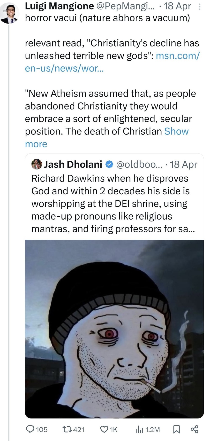 In the blizzard of memes, conspiracy theories, political finger pointing, and tons of folks celebrating a wicked act of murder as though it was righteousness personified I spotted a screenshot from Mario Mangione’s twitter feed. In it, he shared a link to a Telegraph article prophetically titled: “Christianity’s Decline Has Unleashed Terrible New Gods.”